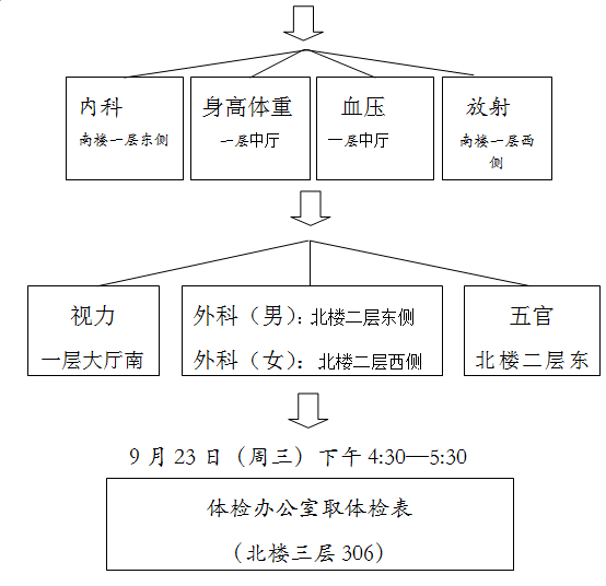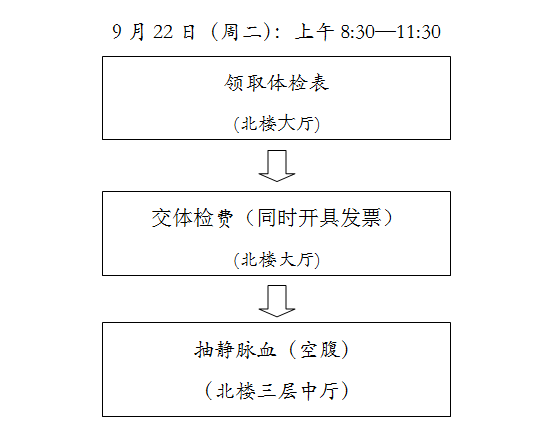 各位考生:为配合北航研究生院2016年接收推免考生攻读研究生(含直博生)工作,校医院为此制定了体检工作安排。体检时间安排在2015年9月22日(星期二)上午。考生在体检前,一定保持空腹前来领表抽血,然后可以进食,也可以直接到各科室进行规定科目的检查。抽血一定要在上午7:30—9:00之间空腹进行,其他各项检查可在用餐后进行。体检费用按《北京市统一医疗服务收费标准》为每人136元。具体体检流程如下: