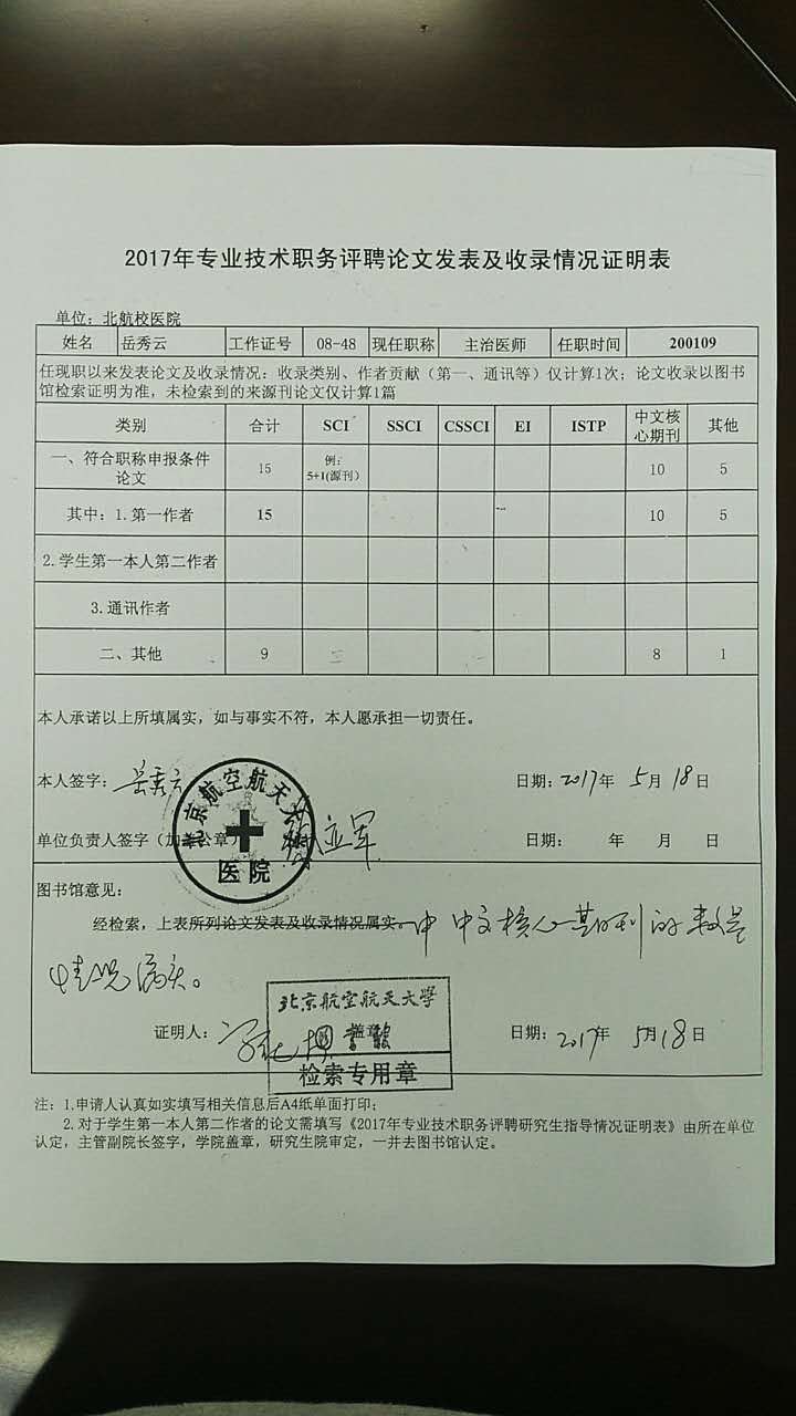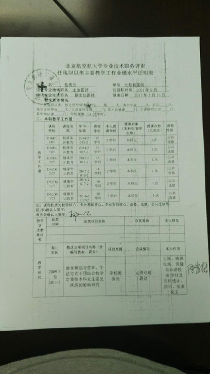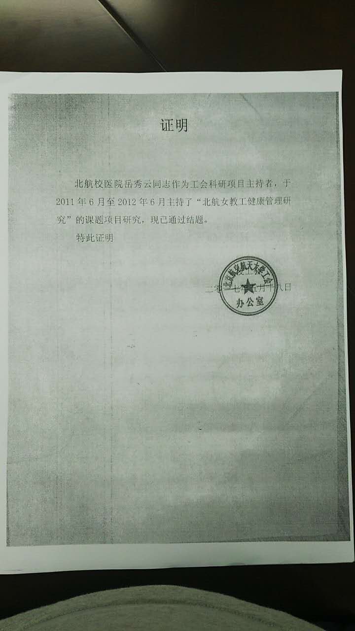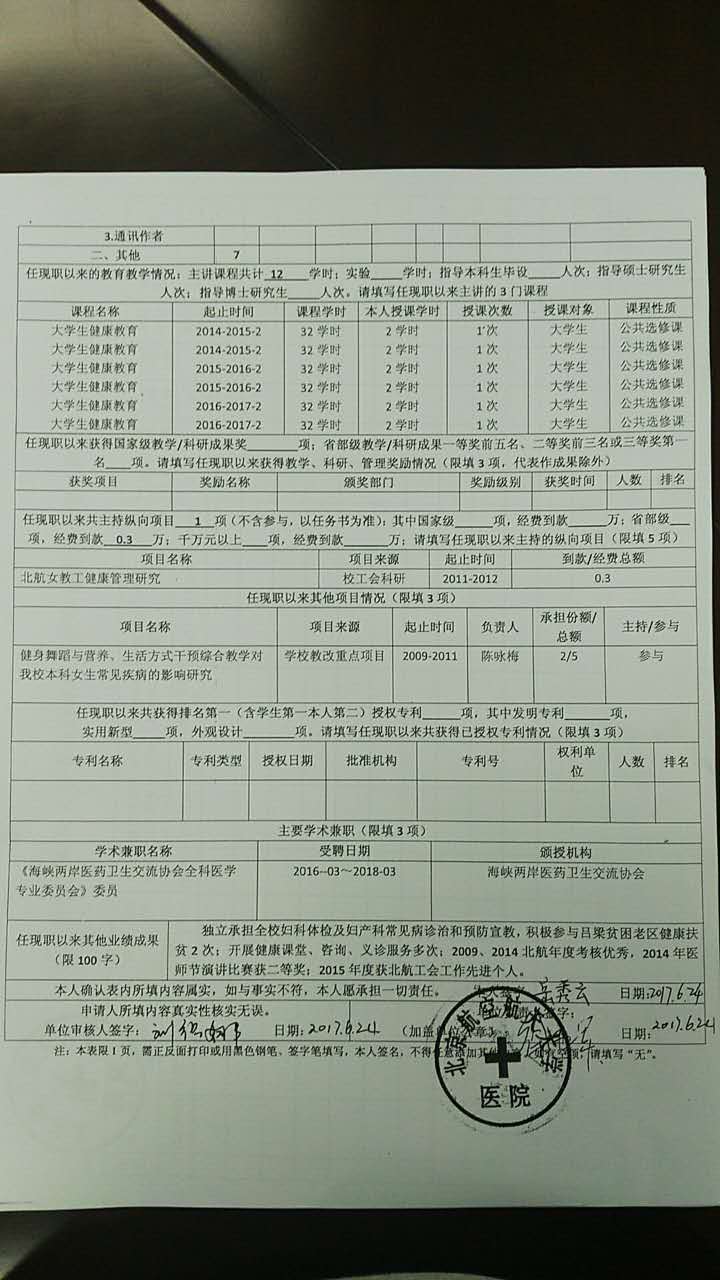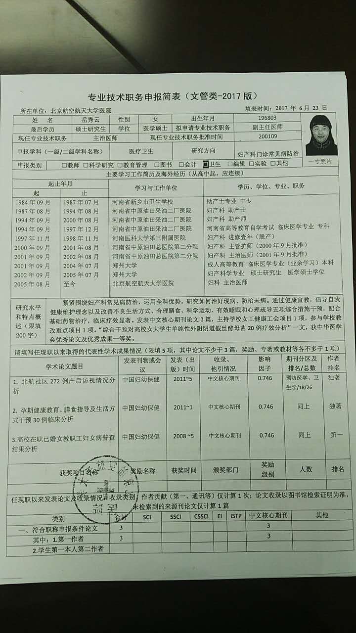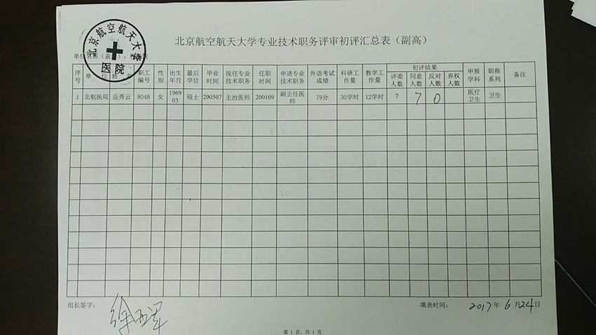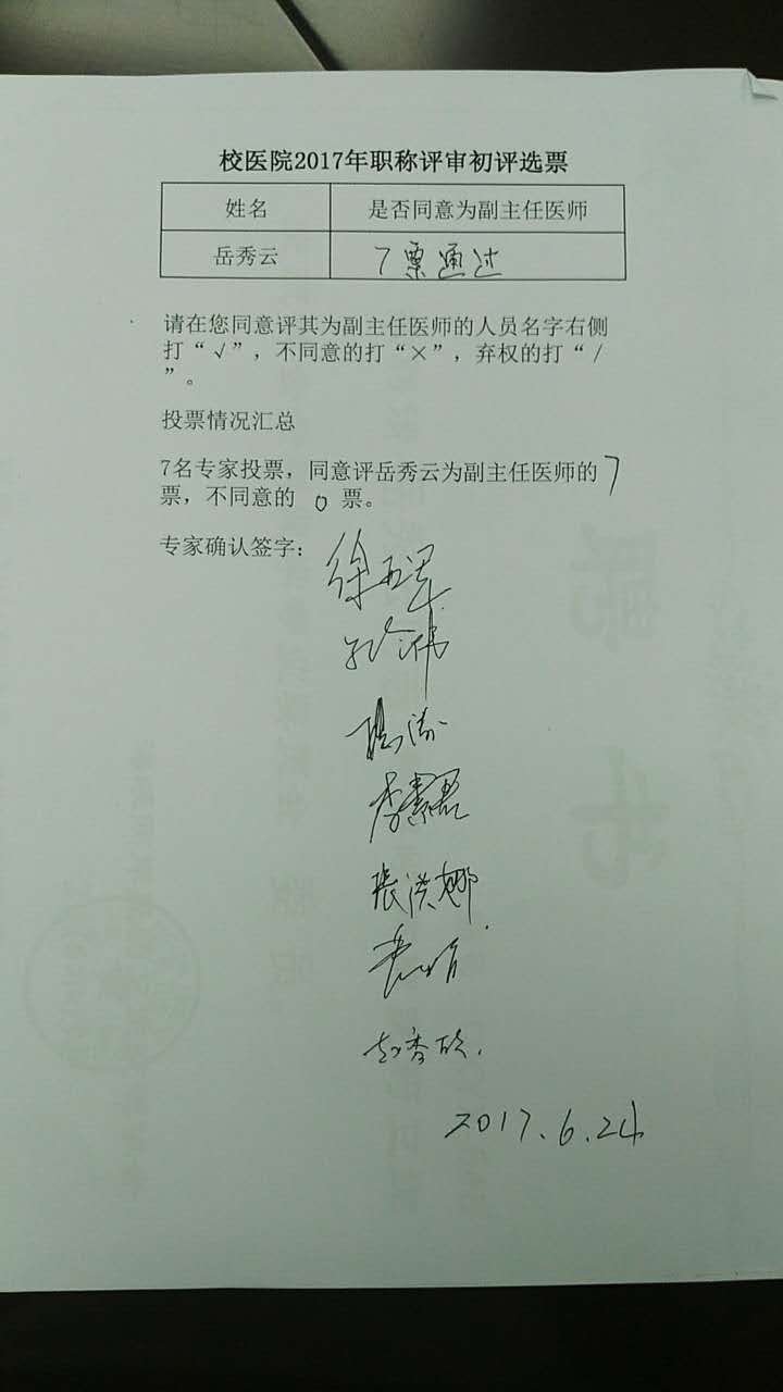 校医院职称评审初评组于2017年6月24日对今年申报副高职称的岳秀云同志进行了初评。经过七名校外及校内专家的考核,岳秀云同志通过了初评。