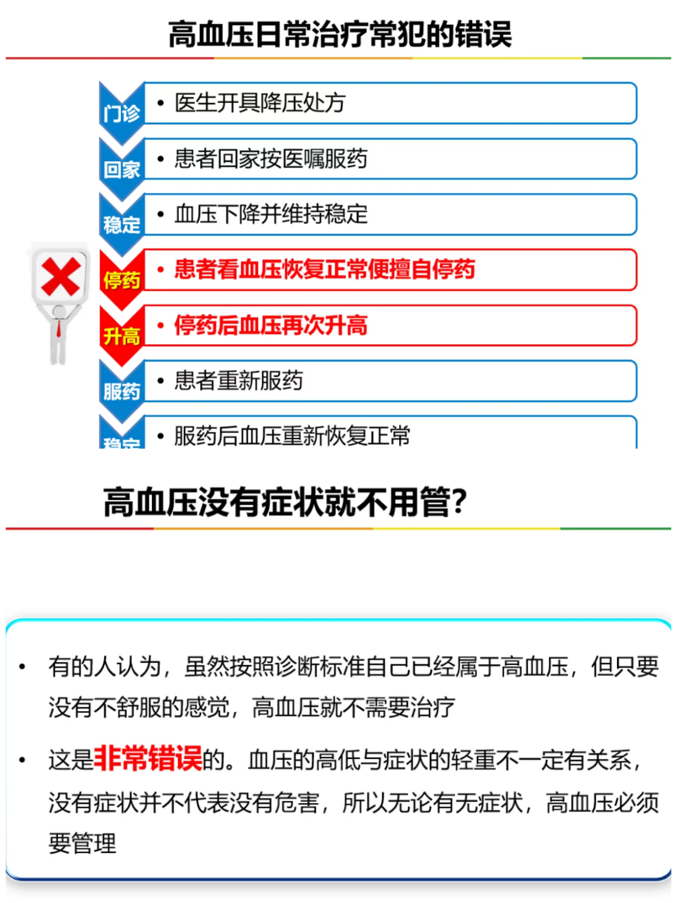 在讲解高血压日常治疗常犯错误中,钱医生特意提到患者看血压恢复正常便擅自停药引起血压再次升高、患者患高血压但无不适症状就没有进行治疗等行为引起的后续健康问题,强调应用科学、正确的方式管理血压。