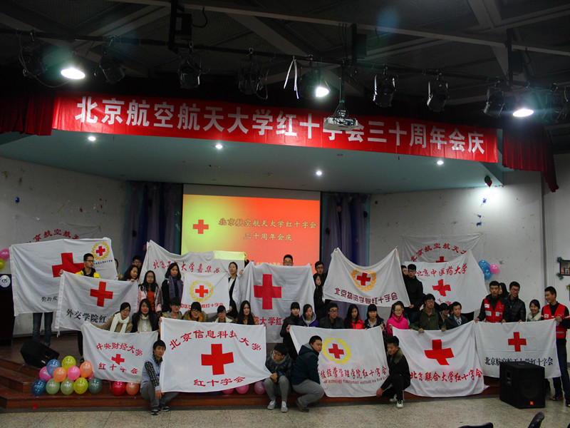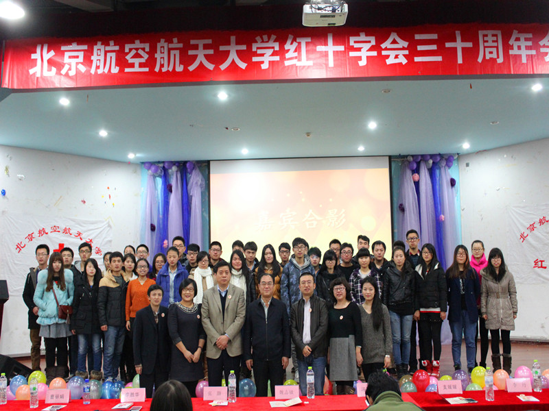 2014年12月13日下午,北航红十字会三十周年会庆在北航沙河校区多功能厅举行。北航红十字会会长魏志敏副校长,中国红十字会青少处张灏处长,北京市红十字会志愿服务部冯克军部长,北京市红十字会学校工作委员会李胜华副秘书长,我校团委、校医院相关领导,北航红会学生分会会长以及来自首都二十余所高校的一百余名红十字青少年参加会庆。